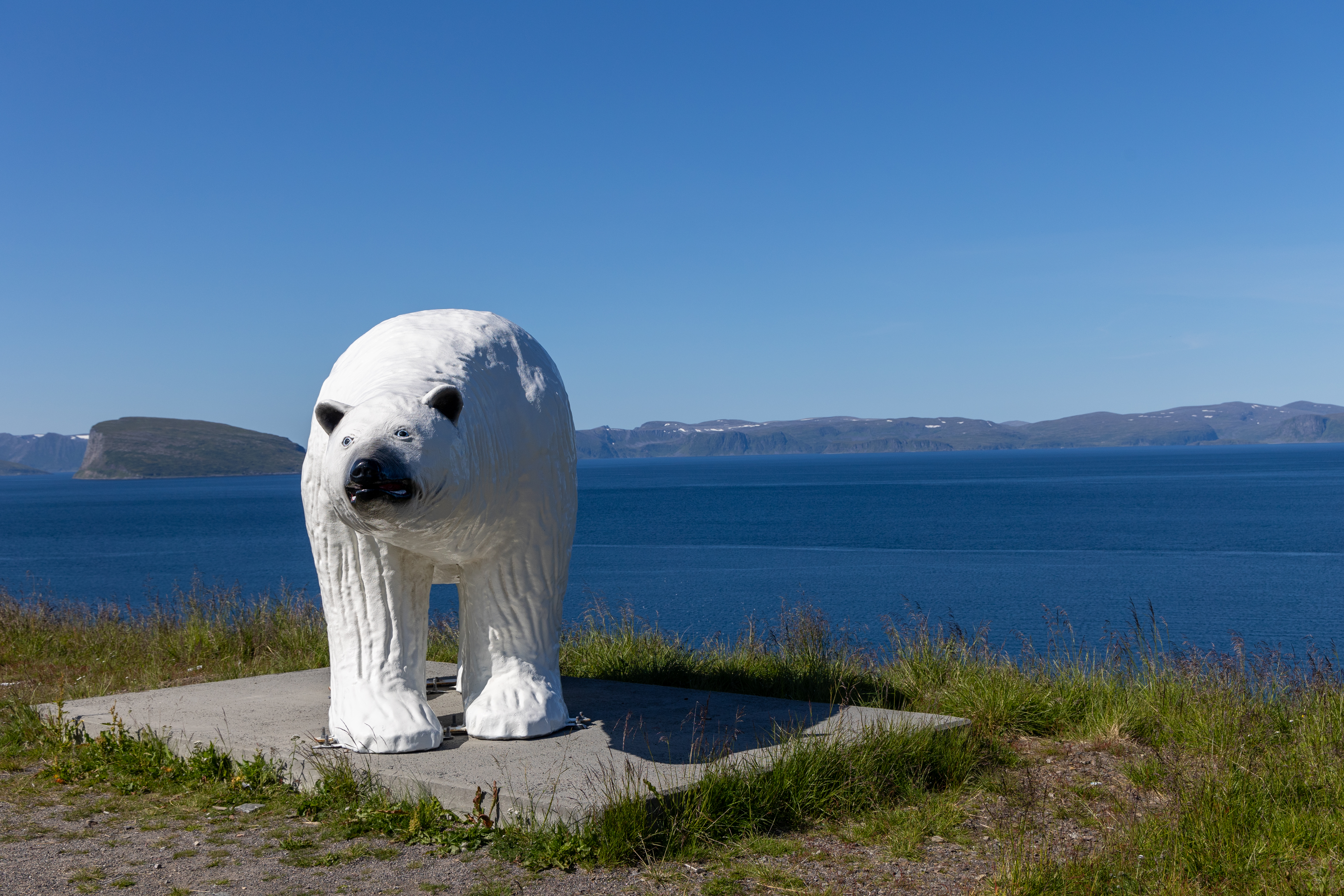 _N5A8010 25. Juli 2023 5472 × 3648 Norwegens Eismeerküste – Von Grense Jakobselv an der Barentssee nach Hammerfest am Nordmeer Der Eisbär. Das Wahrzeichen von Hammerfest Blick auf die Stadt